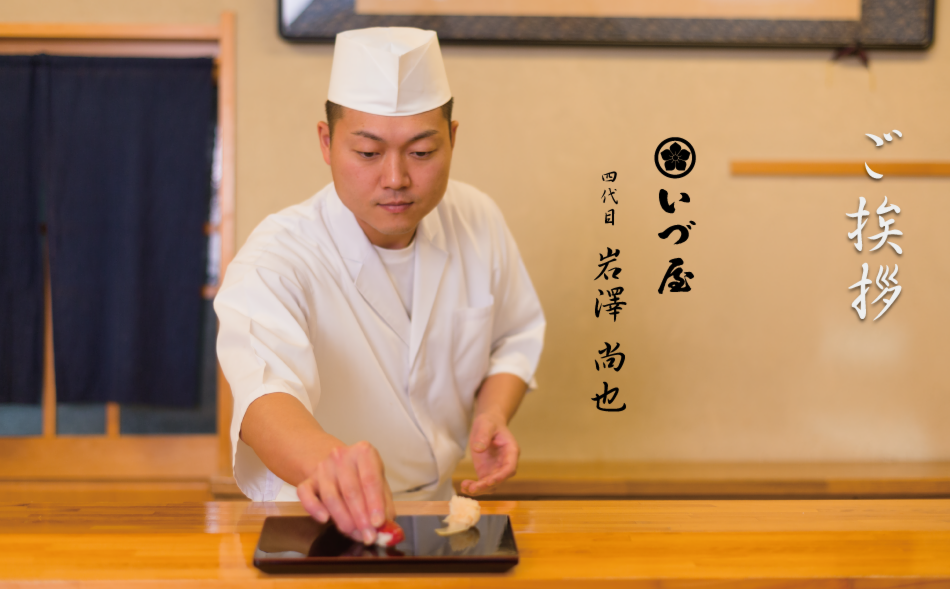 この屋号は、初代の故郷である「伊豆」に由来しています。その昔、遠い海から運ばれてくる魚は、山梨の人たちにとって貴重な「贈り物」でした。先代達がその一つ一つを丁寧に調理し、皆様にもっとも喜ばれる形で振舞ってきました。これから、地元山梨のため、そして大切ないづ屋の暖簾を四代目として守りながら、一生懸命精進していきたいと思います。どうぞ宜しくお願い申し上げます。