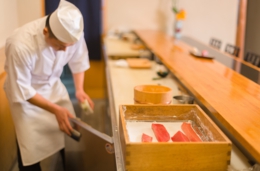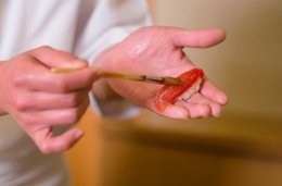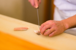 お客様にお出しする瞬間まで、なに一つ手を抜く事はしません。仕入れは私自身が築地へ行き、自分の目で確かめて魚を選びます。お店に届いた食材を丁寧に仕込み、最後のひと手間を加えるまで全てが真剣勝負です。